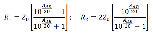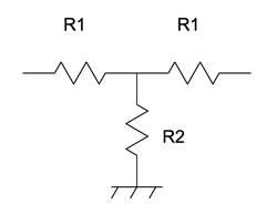 パスタナックのT型減衰器 (Tパッドとも呼ばれる)計算ツールを用いて、T型減衰器の抵抗値 (R1 & R2)を算出できます(単位: Ω)。