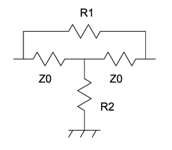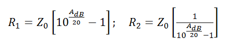 パスタナックのブリッジT型減衰計算は、ブリッジT減衰器の抵抗値 (R1 & R2) (単位: Ω)を決定するために使用されます。