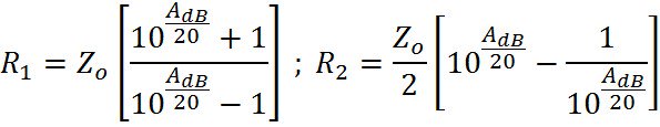パスタナックのPi (π) 減衰器計算ツールを用いて、抵抗値 (R1およびR2) を決定することができます。