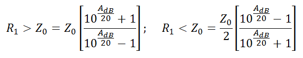 パスタナックの減衰反射計算ツールを用いて、反射型減衰器の2つ想定する抵抗値の決定に役立ちます。(R1 > Z0 & R1 < Z0) (単位: Ω)