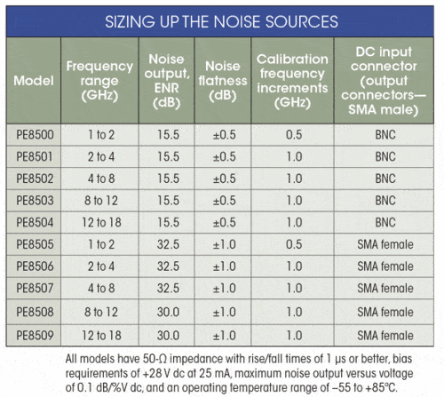 本シリーズは10型番からなる(特性は表を参照)。周波数範囲は、それぞれ 1 ~ 2 GHz、2 ~ 4 GHz、4 ~ 8 GHz、8 ~ 12 GHz、 12 ~ 18 GHzだ。 中出力、および高出力で、過剰雑音比(ENR) 出力レベルは各々 15、30、32.5 dB となっている。高出力ノイズレベルのため、BERやNF測定といった、ほとんどの一般的なテスト用途に適用できる。反対にENRレベルが低いと用途は限定されてしまう。